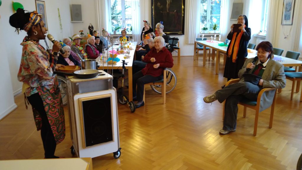 und geschunkelt. Zwei Praktikanten spielten einen Sketch – der Feierabend -, und es gab eine Büttenrede über das weltbewegende Thema „Flatulenzen“. Zum Mitmachen wurden die Gäste angeregt bei einem Rätsel und bei mehreren Sitztänzen. Schon zu Beginn sorgte das „Gute Laune Lied“ für Stimmung. Außerdem gab es noch ein Spiel, bei dem die Teilnehmerinnen schnellstmöglich eine lange Bahn von Zeitungen mit ihren Füßen unter ihren Stuhl ziehen mussten. Die Stimmung war fröhlich und am Ende bedankten sich die Gäste für den schönen Tag.
