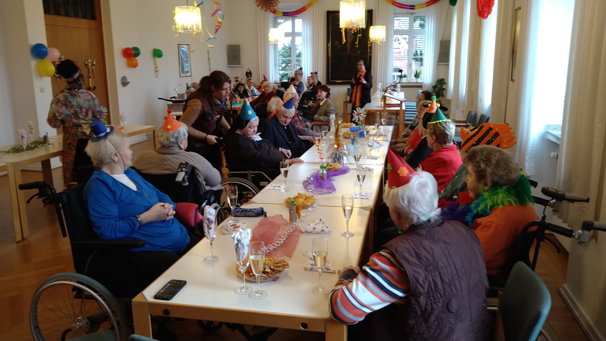 Das Team der Sozialen Betreuung lud zum Karneval ins bunt geschmückte Exerzitien-Refektor ein. Bei Sekt und Knabbereien wurde viel gelacht