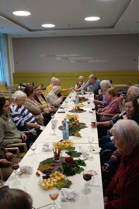 Die Soziale Betreuung hatte zum Weinfest eingeladen. Zu fröhlichen Liedern und Wortbeiträgen wurden verschiedene Weinsorten und Traubensaft, sowie Käsehäppchen und Salzgebäck angeboten. Die Stimmung war gut, ein Sitztanz brachte alle in Schwung und es wurde viel gelacht und sich unterhalten. Die liebevoll dekorierten Tische wurden von den Bewohner/innen sehr gelobt. Beim Verabschieden hatten alle ein Lächeln im Gesicht.